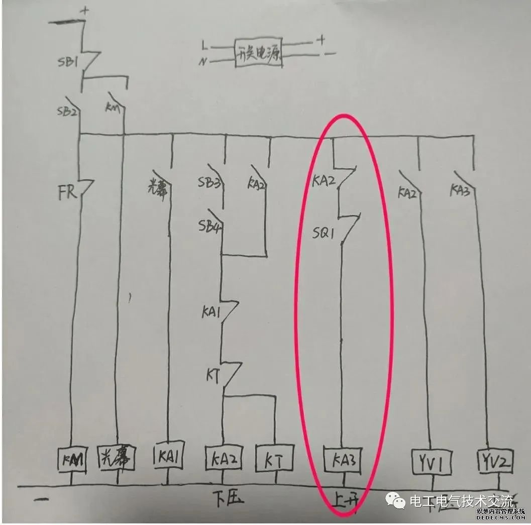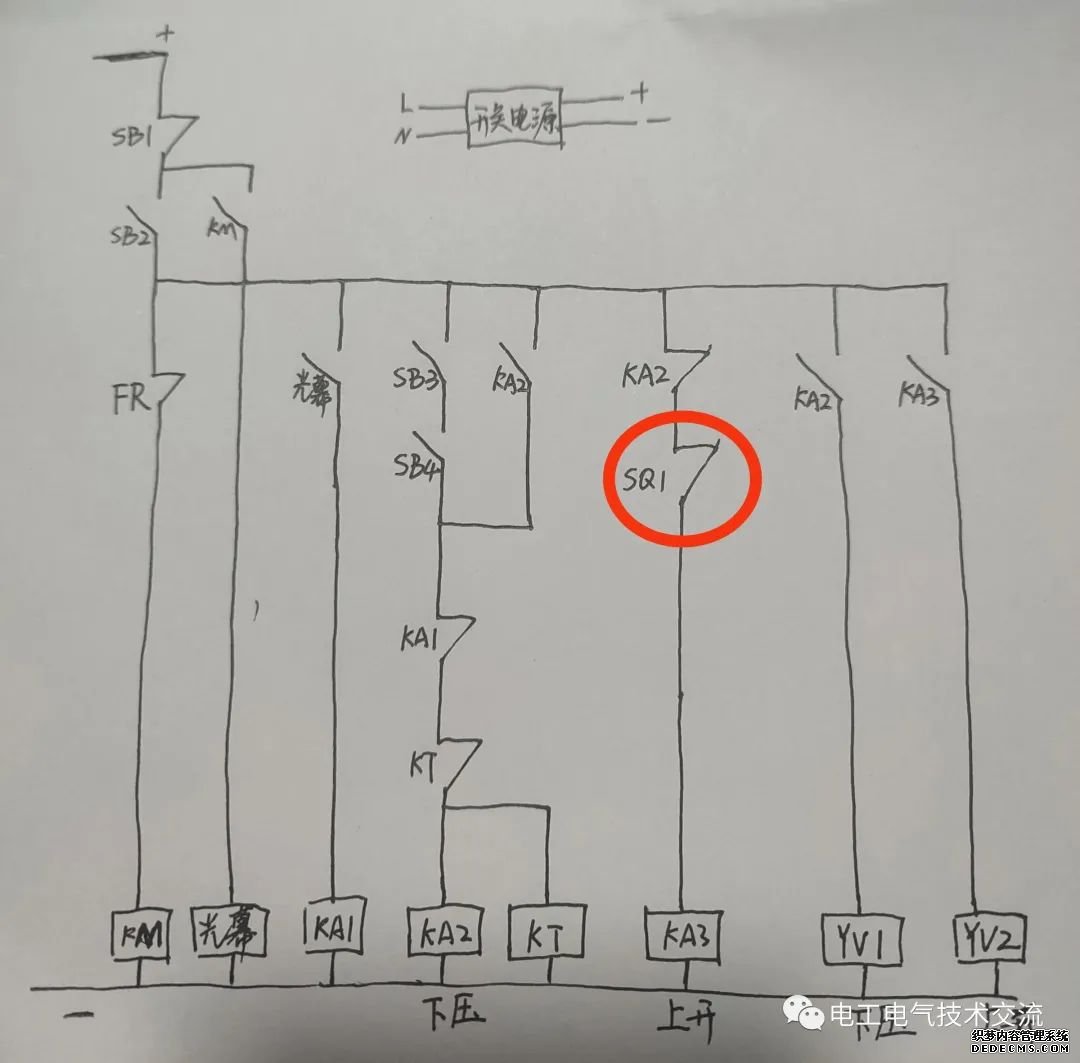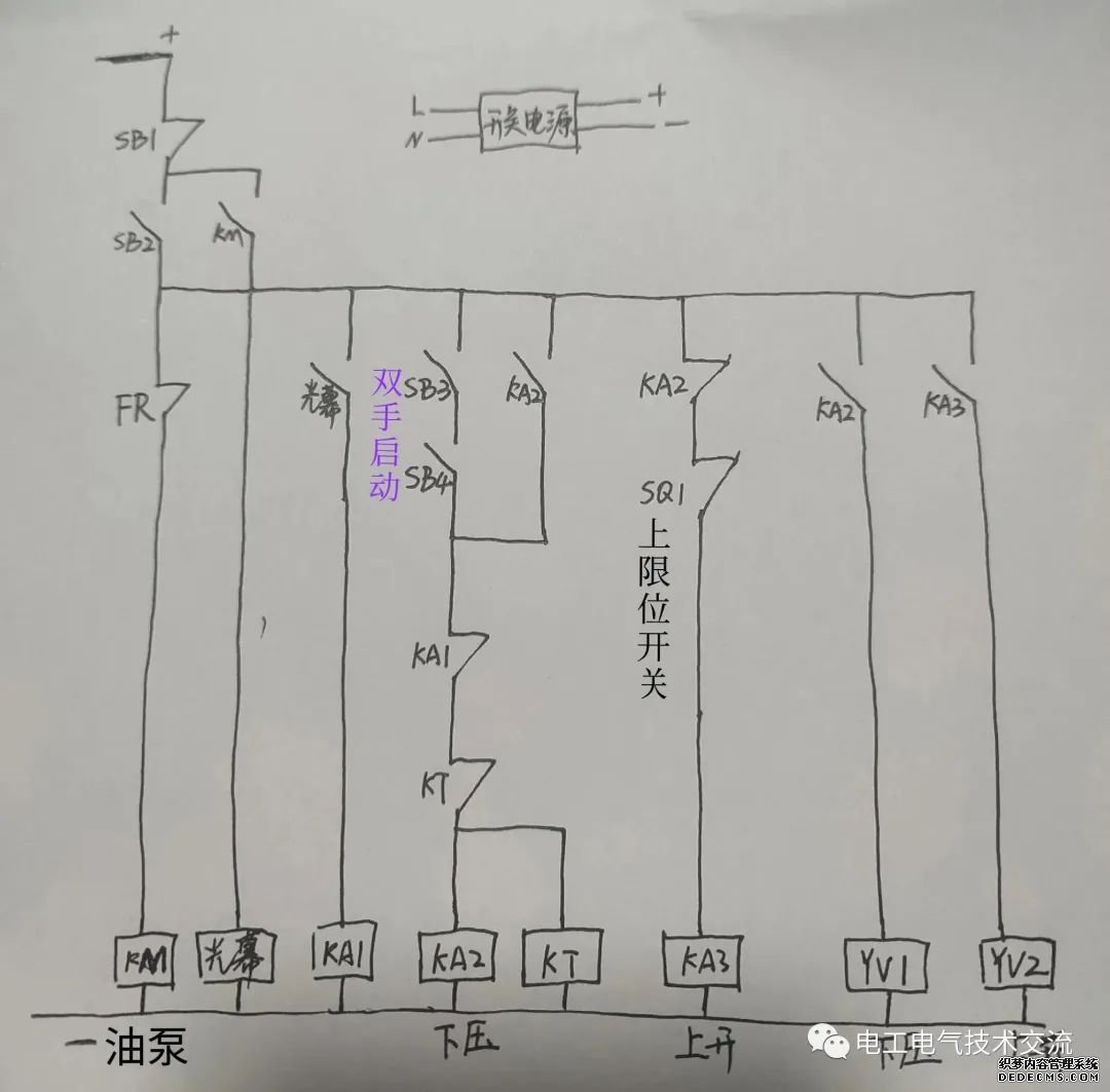 按下啟動(dòng)按鈕SB2,油泵工作后立即按下雙手按鈕油壓機(jī)下壓,松手后,液壓機(jī)正常。文章由電工小知識分享電友編著,版權(quán)歸原作者,向電友致敬!