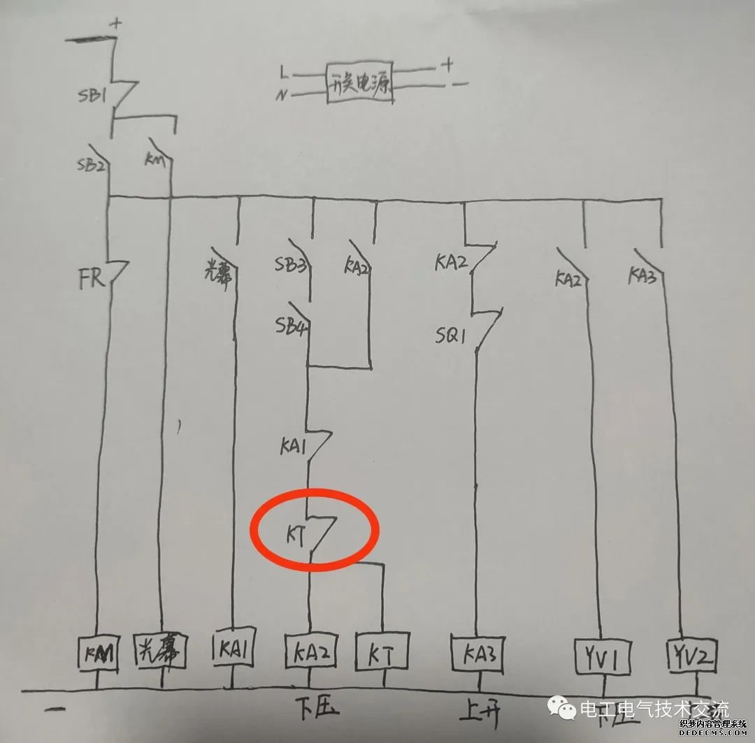 KT設(shè)置下壓的時(shí)間,根據(jù)工藝需要設(shè)置相應(yīng)的時(shí)間,時(shí)間到時(shí),KA2斷電,KA3通電,電磁閥YV2通電,液壓機(jī)上升。